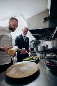 Il y a deux ans, Laurent Gauze, Président de la Chambre de commerce et d’industrie des Pyrénées-Orientales et élu local, répondait au questionnaire épicurien du magazine. On y parlait plaisirs de table, souvenirs gourmands et produits de cœur. Cette fois, la rencontre se déroule derrière les fourneaux, dans la cuisine d’Aurélien Potard. Une conversation qui commence autour de la gastronomie mais qui, très vite, s’ouvre sur un sujet bien plus vaste : l’avenir et les potentialités d’un territoire.