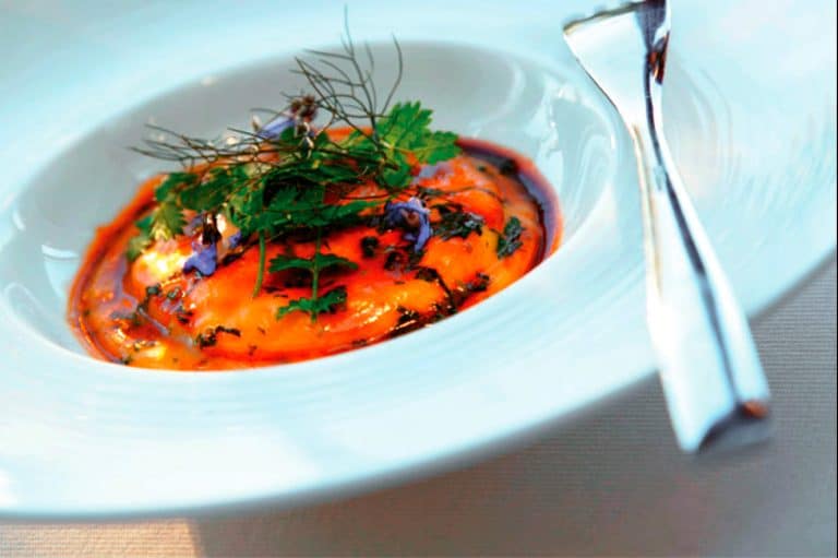 Pocher la raviole dans une eau frémissante 2 mn maximum, la dresser dans une assiette creuse et l’arroser généreusement du bouillon d’oignons* “Vintage”, finir l’assiette avec des pousses de fenouil sauvage, de pimprenelle et quelques fleurs de bourrache.