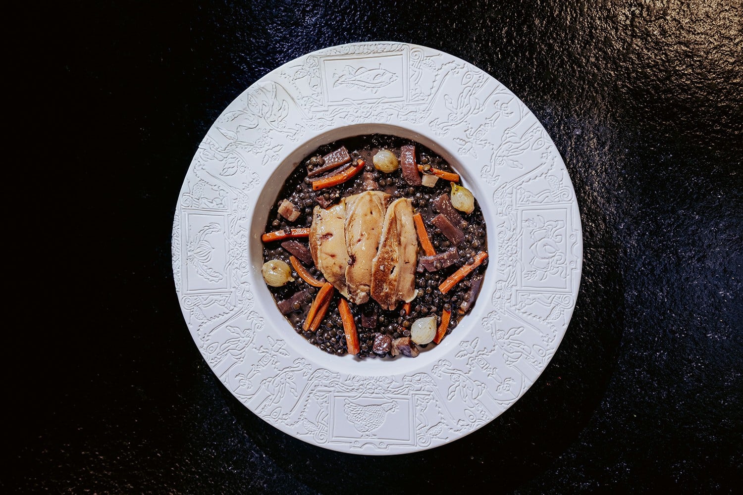 / SAUCE : chauffer le bouillon réduit, crémer, faire cuire puis monter au gras de canard. Lier légèrement en mixant 75 g de lentilles cuites dedans. Passer au chinois et réserver.