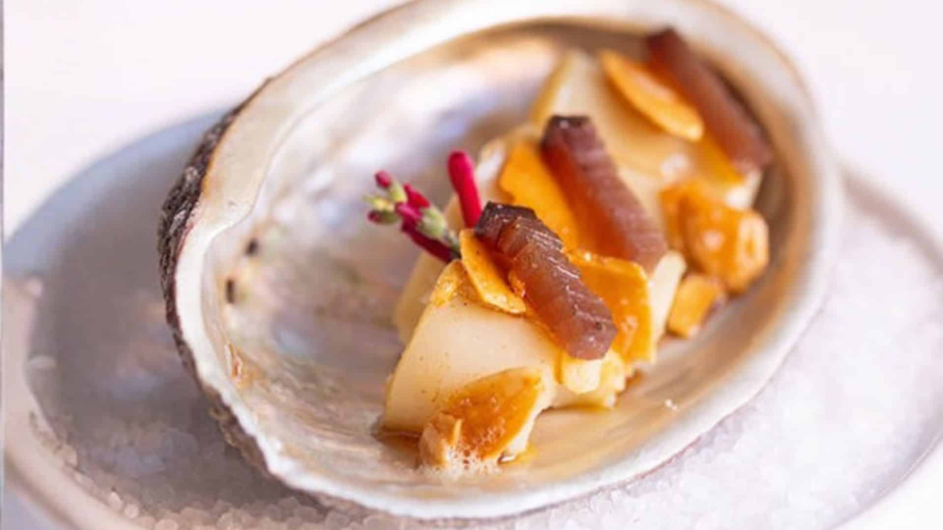 / 4. MONTAGE DANS LA COQUILLE : déposer les rouleaux d’ormeau dans la coquille nettoyée. Ajouter quelques gouttes du beurre noisette filtré.