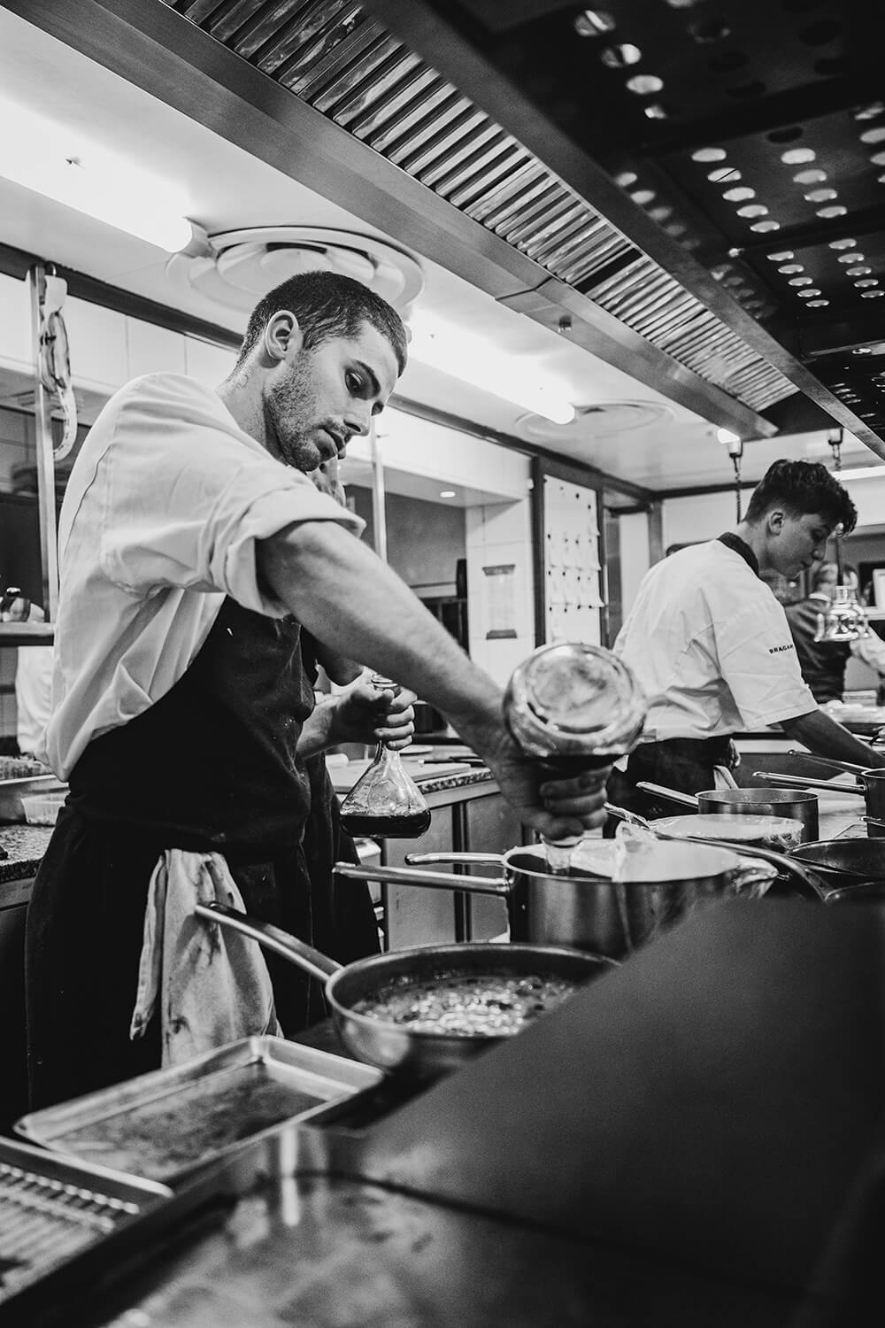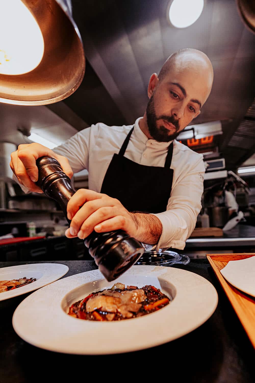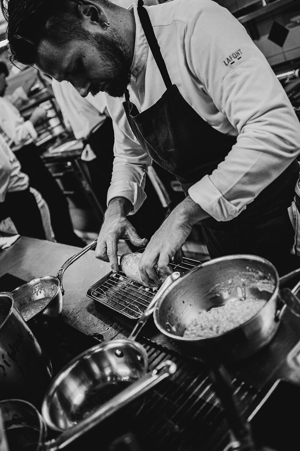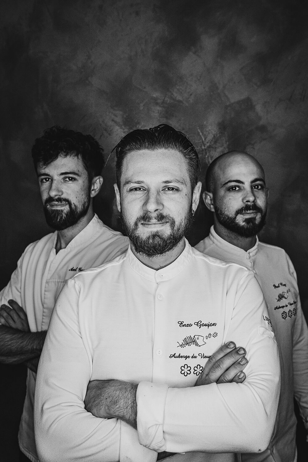Trois jeunes chefs formés à l’école Goujon, trois regards différents, mais un même amour du métier. Enzo, l’aîné, a préféré partir avant de revenir. Curieux, voyageur, il a fait ses classes dans les plus grandes maisons : chez Daniel Boulud à New York, Paul Pairet à Shanghai, Arnaud Donckele à Saint-Tropez, Régis Marcon, Patrick Jeffroy… “Je voulais comprendre comment ça se passait ailleurs.” Mais le retour à Fontjoncouse était une évidence. “Ici, on fait une cuisine de goût, de saveur, d’émotion. On veut la faire vivre, pas la copier.” Il partage aujourd’hui la responsabilité des cuisines avec Paul, chacun trouvant sa place comme second. Paul Rey n’a pas le nom des Goujon, mais il en a l’âme. Né à Fontjoncouse, il a grandi avec Enzo et Axel : “Ma grand-mère était la nounou d’Enzo. On était les seuls enfants du village, on a tout vécu ensemble”. À 18 ans, il entre à l’auberge et n’en repartira plus. “Ce que le chef nous a appris, c’est le beau geste, le respect du produit. Mon plaisir, c’est celui que l’on donne aux gens.”