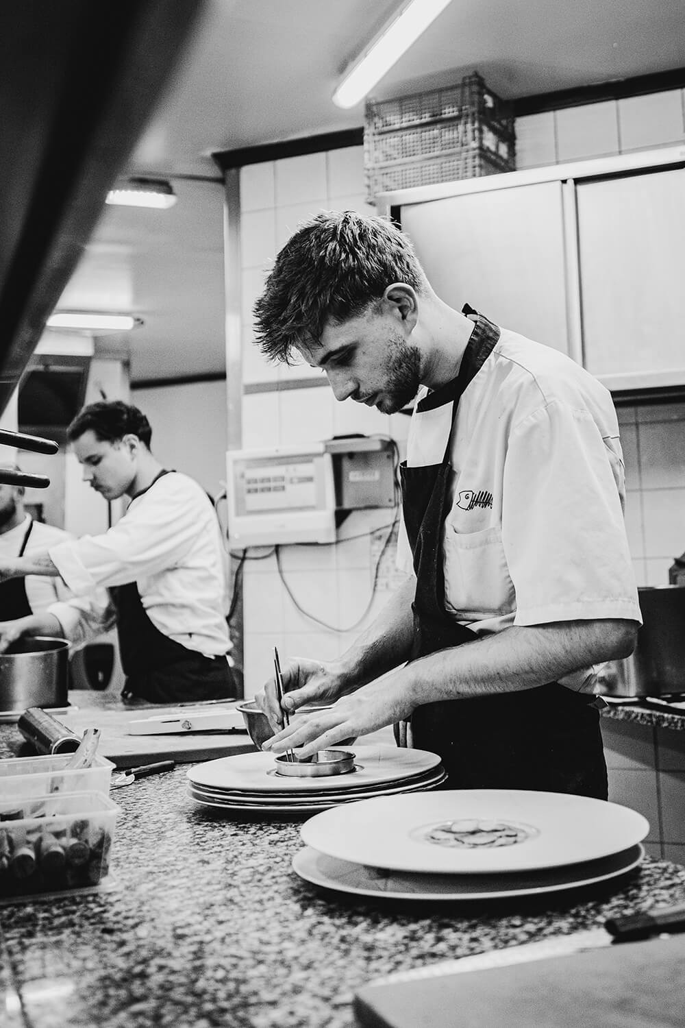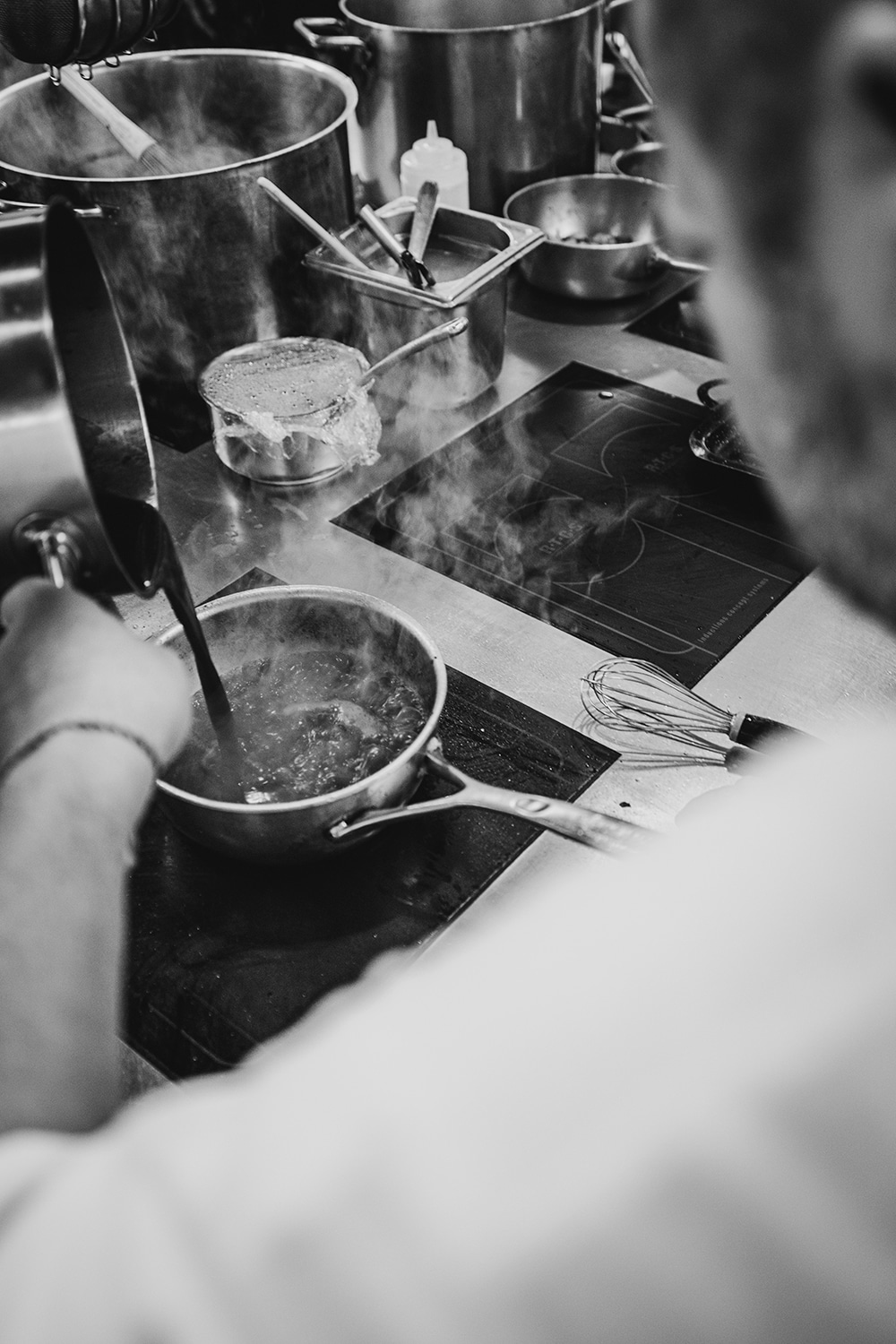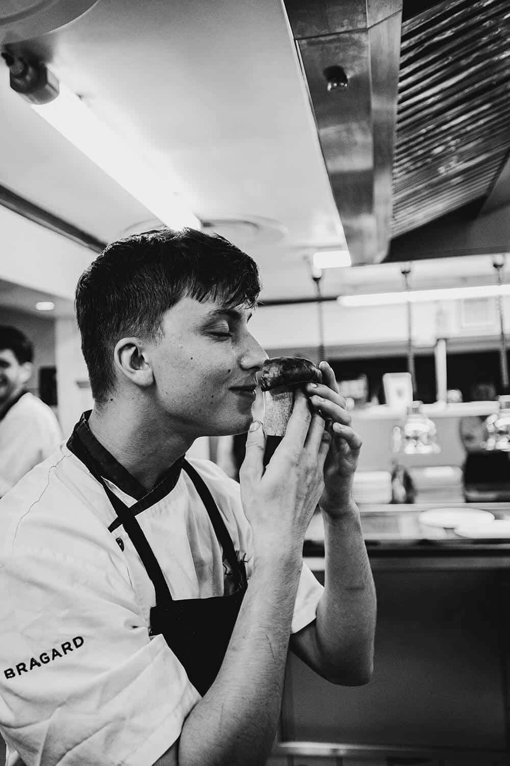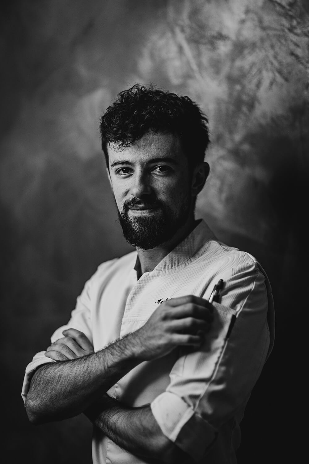 Trois jeunes chefs formés à l’école Goujon, trois regards différents, mais un même amour du métier. Enzo, l’aîné, a préféré partir avant de revenir. Curieux, voyageur, il a fait ses classes dans les plus grandes maisons : chez Daniel Boulud à New York, Paul Pairet à Shanghai, Arnaud Donckele à Saint-Tropez, Régis Marcon, Patrick Jeffroy… “Je voulais comprendre comment ça se passait ailleurs.” Mais le retour à Fontjoncouse était une évidence. “Ici, on fait une cuisine de goût, de saveur, d’émotion. On veut la faire vivre, pas la copier.” Il partage aujourd’hui la responsabilité des cuisines avec Paul, chacun trouvant sa place comme second. Paul Rey n’a pas le nom des Goujon, mais il en a l’âme. Né à Fontjoncouse, il a grandi avec Enzo et Axel : “Ma grand-mère était la nounou d’Enzo. On était les seuls enfants du village, on a tout vécu ensemble”. À 18 ans, il entre à l’auberge et n’en repartira plus. “Ce que le chef nous a appris, c’est le beau geste, le respect du produit. Mon plaisir, c’est celui que l’on donne aux gens.”