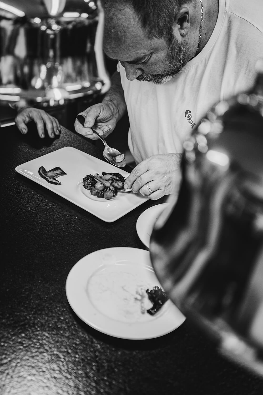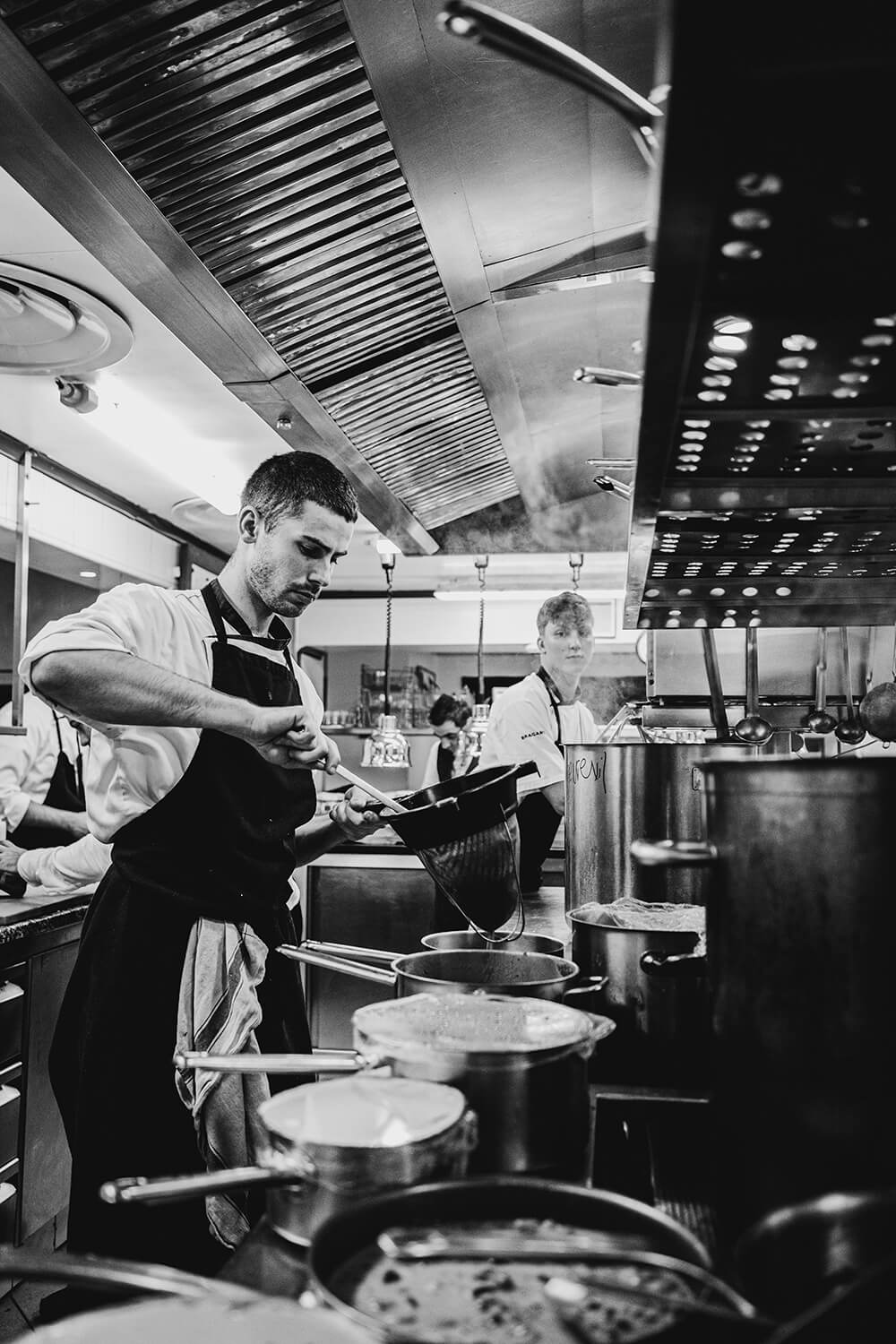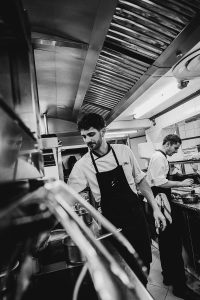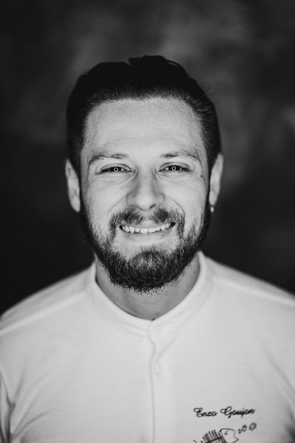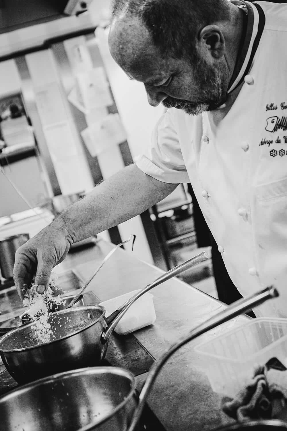 Trois jeunes chefs formés à l’école Goujon, trois regards différents, mais un même amour du métier. Enzo, l’aîné, a préféré partir avant de revenir. Curieux, voyageur, il a fait ses classes dans les plus grandes maisons : chez Daniel Boulud à New York, Paul Pairet à Shanghai, Arnaud Donckele à Saint-Tropez, Régis Marcon, Patrick Jeffroy… “Je voulais comprendre comment ça se passait ailleurs.” Mais le retour à Fontjoncouse était une évidence. “Ici, on fait une cuisine de goût, de saveur, d’émotion. On veut la faire vivre, pas la copier.” Il partage aujourd’hui la responsabilité des cuisines avec Paul, chacun trouvant sa place comme second. Paul Rey n’a pas le nom des Goujon, mais il en a l’âme. Né à Fontjoncouse, il a grandi avec Enzo et Axel : “Ma grand-mère était la nounou d’Enzo. On était les seuls enfants du village, on a tout vécu ensemble”. À 18 ans, il entre à l’auberge et n’en repartira plus. “Ce que le chef nous a appris, c’est le beau geste, le respect du produit. Mon plaisir, c’est celui que l’on donne aux gens.”