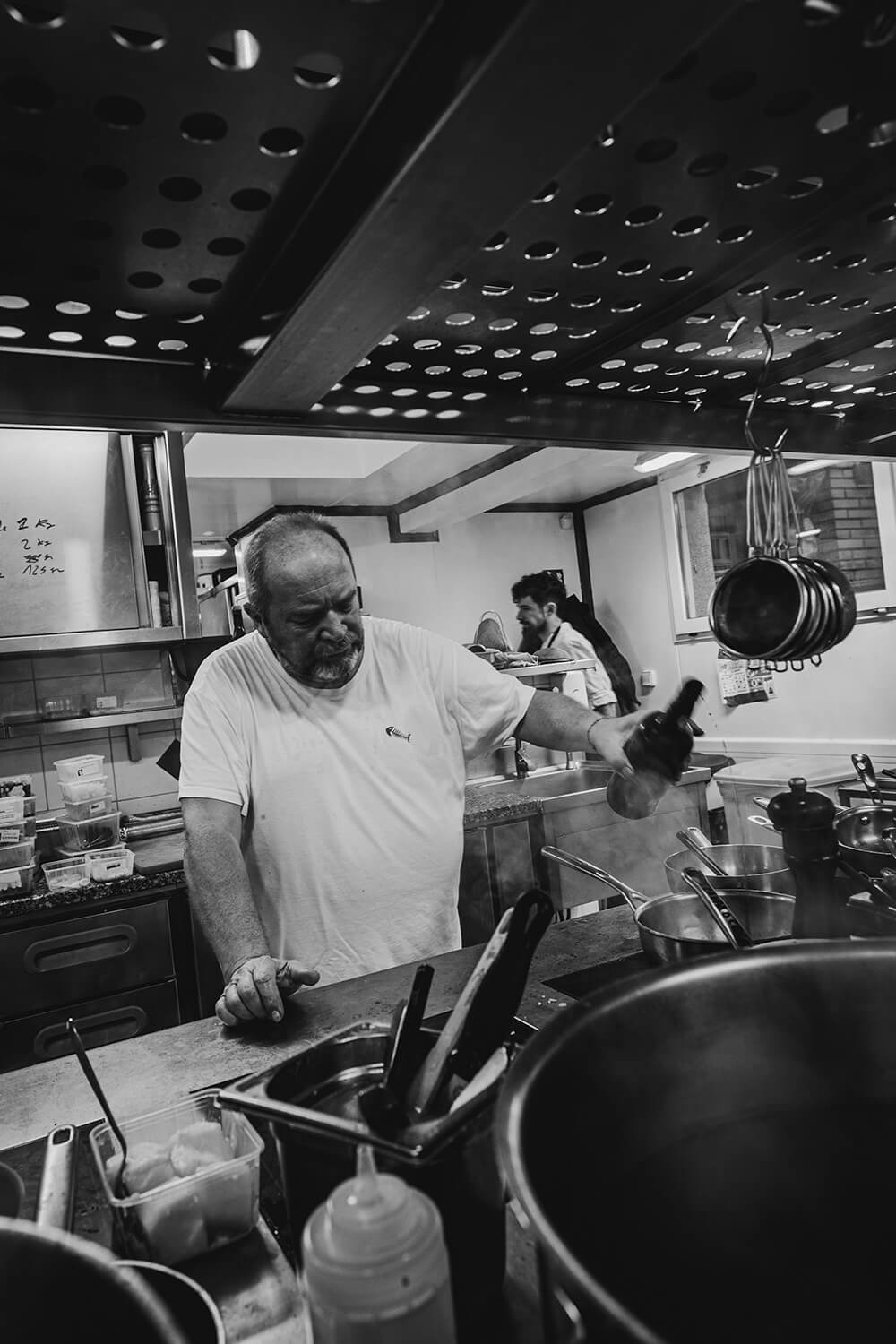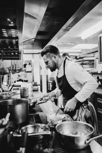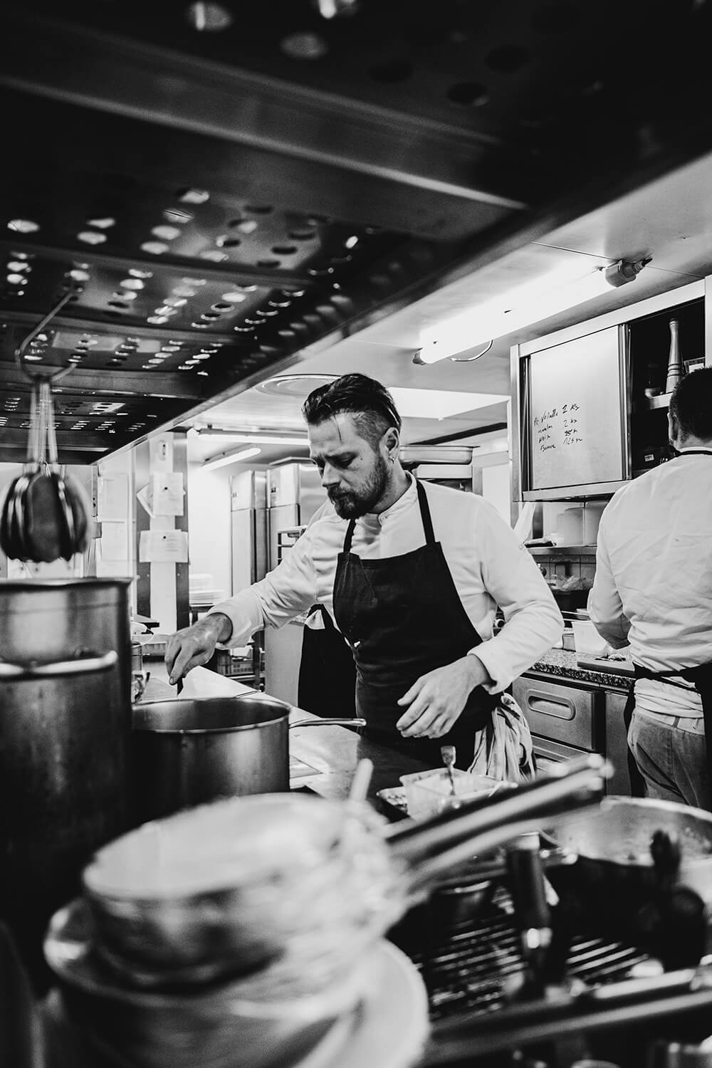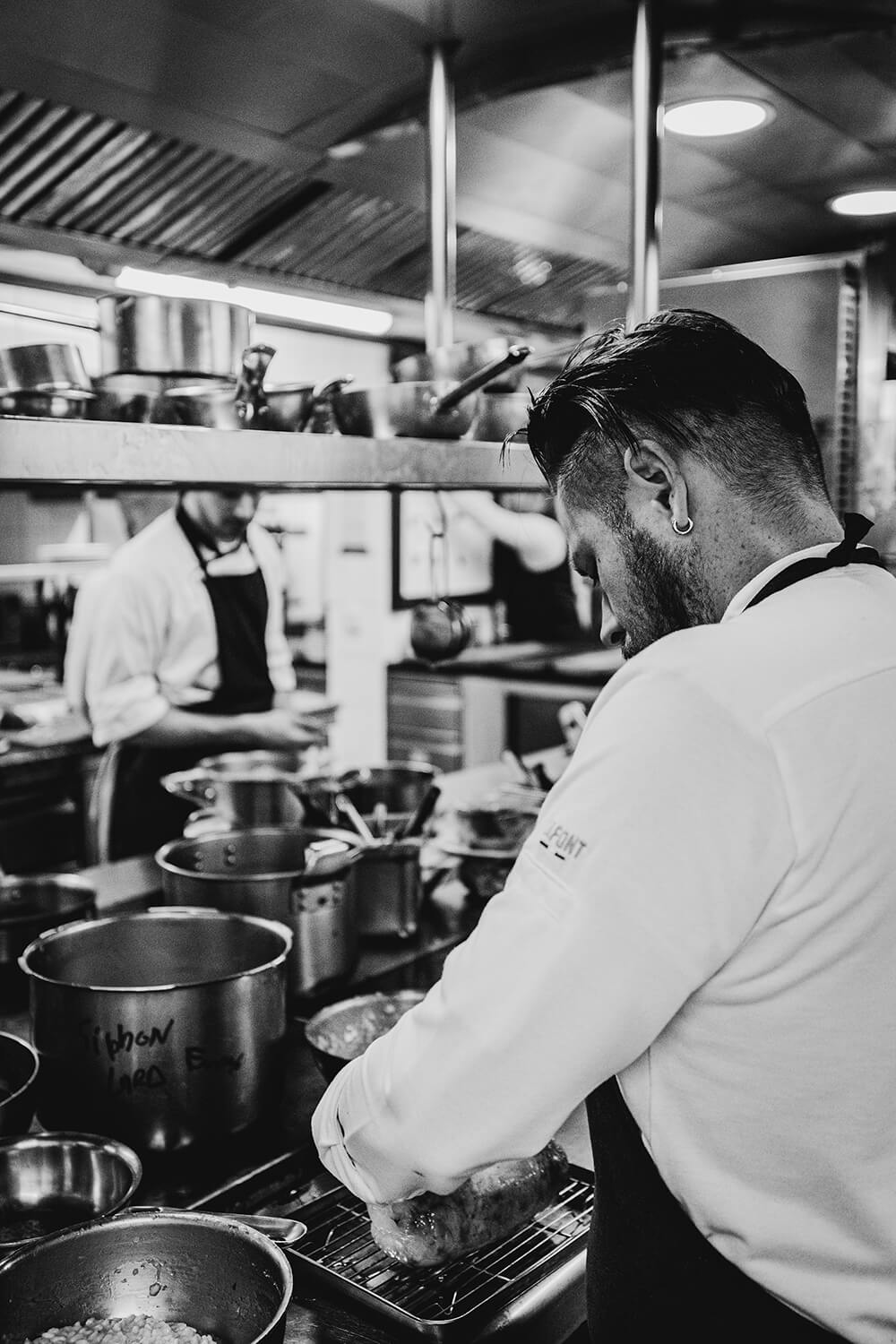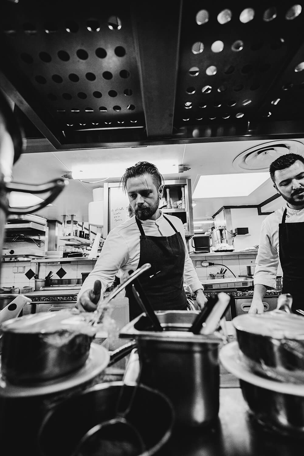 Trois jeunes chefs formés à l’école Goujon, trois regards différents, mais un même amour du métier. Enzo, l’aîné, a préféré partir avant de revenir. Curieux, voyageur, il a fait ses classes dans les plus grandes maisons : chez Daniel Boulud à New York, Paul Pairet à Shanghai, Arnaud Donckele à Saint-Tropez, Régis Marcon, Patrick Jeffroy… “Je voulais comprendre comment ça se passait ailleurs.” Mais le retour à Fontjoncouse était une évidence. “Ici, on fait une cuisine de goût, de saveur, d’émotion. On veut la faire vivre, pas la copier.” Il partage aujourd’hui la responsabilité des cuisines avec Paul, chacun trouvant sa place comme second. Paul Rey n’a pas le nom des Goujon, mais il en a l’âme. Né à Fontjoncouse, il a grandi avec Enzo et Axel : “Ma grand-mère était la nounou d’Enzo. On était les seuls enfants du village, on a tout vécu ensemble”. À 18 ans, il entre à l’auberge et n’en repartira plus. “Ce que le chef nous a appris, c’est le beau geste, le respect du produit. Mon plaisir, c’est celui que l’on donne aux gens.”