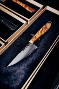 Coutelierdepuis2019, autodidacte formé par passion et par obstination, Cédric Garcia a commencé “avec une petite ponceuse et un four de bijoutier, dans sa cave”. Aujourd’hui encore, il garde cette obsession du geste brut, incarnée par sa signature : les coups de marteau laissés sur le dos des lames, révélés au ponçage. “Mes couteaux sont très influencés par le Japon. Mais les coups de marteau sur le dos, c’est devenu ma signature.” Les lames, façonnées dans un acier inoxydable français de haute qualité, sont pensées pour durer : résistantes, inoxydables, et sans entretien fastidieux. Un choix assumé : “Je veux faciliter la vie de mes clients”.